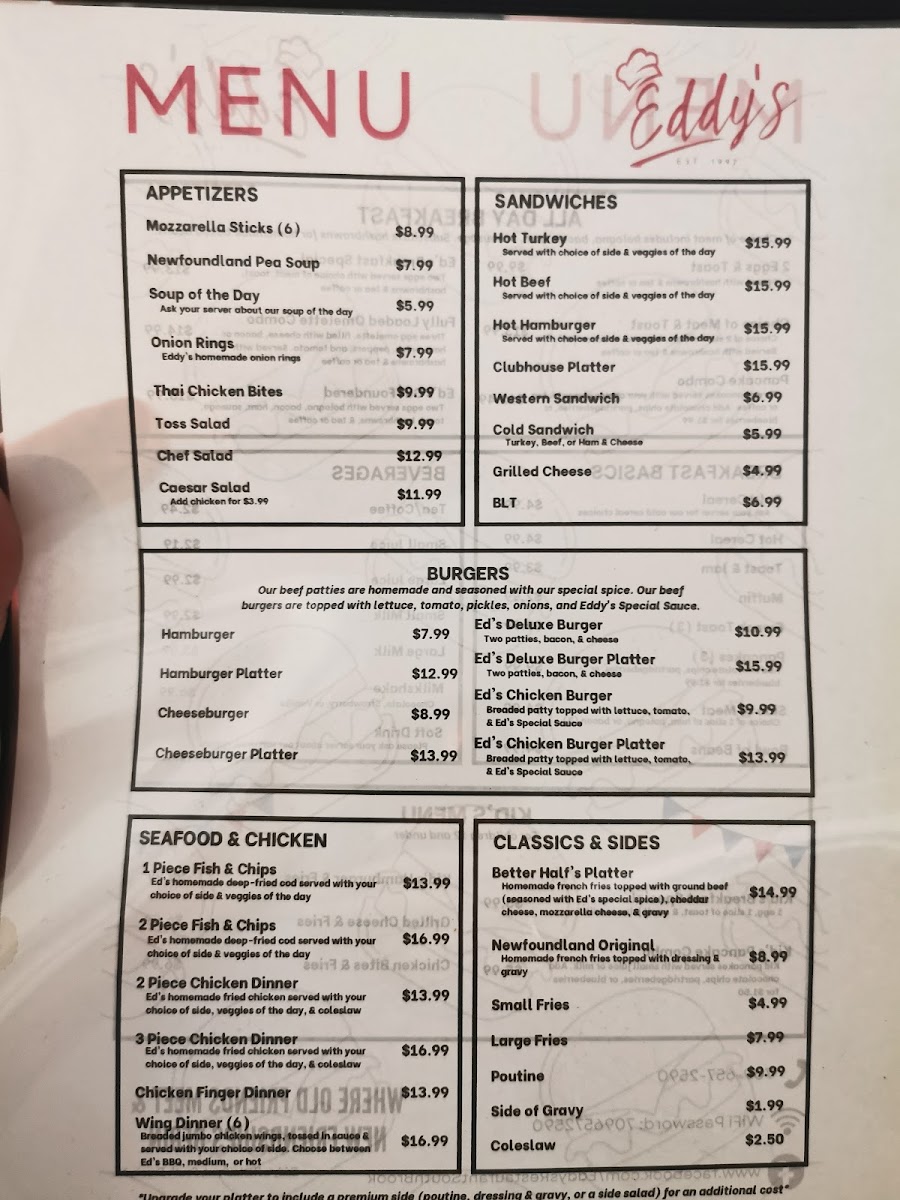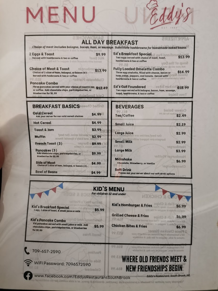 From a reviewer’s perspective, Eddy’s Restaurant And Motel offers a straightforward, comfort‑food driven menu that kicks off with breakfast standouts like the Breakfast Basicseer featuring cold and hot cereals with toast & jam, Muffin, and French Toast, alongside classic choices such as 2 Eggs & Toast, Choice Of Meat & Toast, Pancake Combo, and the hearty Fully Loaded Omelette Combo and iconic Ed’s Gut Foundered. Beverages include refreshing options like Small Juice, Small Milk, Large Milk, Milkshake, and Soft Drink to complement any meal. The Kid’s Menu keeps younger diners happy with crowd‑pleasers such as the Kid’s Breakfast Special, Kid’s Hamburger & Fries, Grilled Cheese & Fries, and Chicken Bites & Fries. Simple sides like French Fries round out the experience, making the menu feel familiar and satisfying for a casual, home‑style dining occasion.